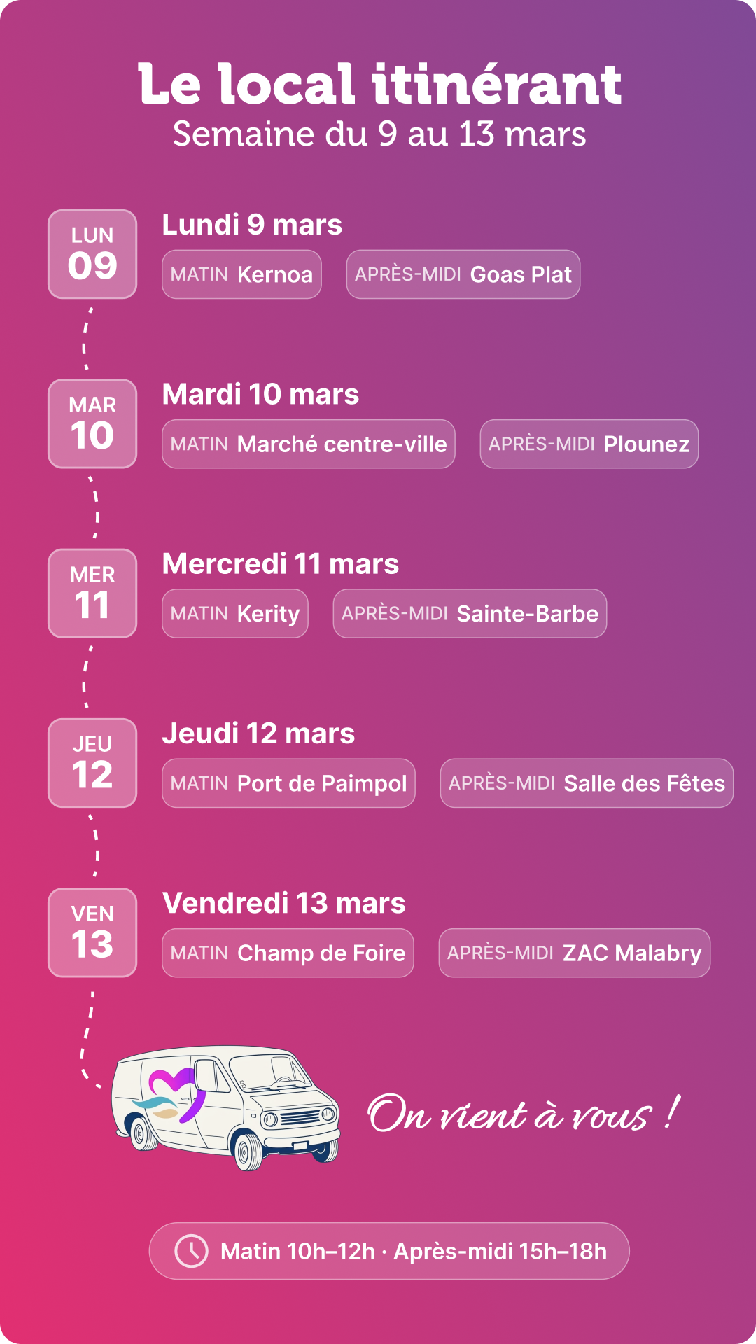 Du lundi 9 au vendredi 13 mars, notre local de campagne prend la route ! Chaque jour, matin et après-midi, nous nous installerons dans un quartier différent de Paimpol pour échanger avec vous, répondre à vos questions et recueillir vos préoccupations.